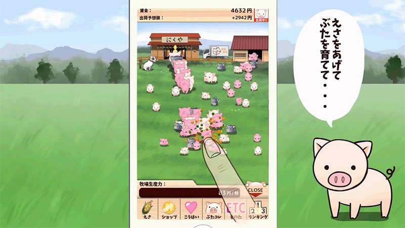 プレイヤーは肉屋の店主から依頼を受けて養豚場を経営することになります。ぶたをタップしてエサをあげ、成長したらトラックをタップして出荷するだけのシンプル操作。放置中もお金が貯まるので、忙しい人でもスキマ時間に遊べます。
